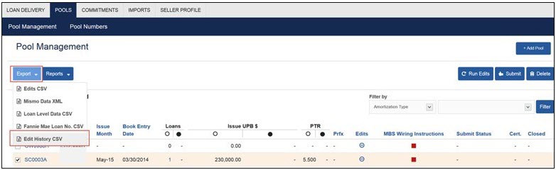 From the Pool or Commitment Management pages select the Pool or Commitment Number for each pool or commitment you want to export.