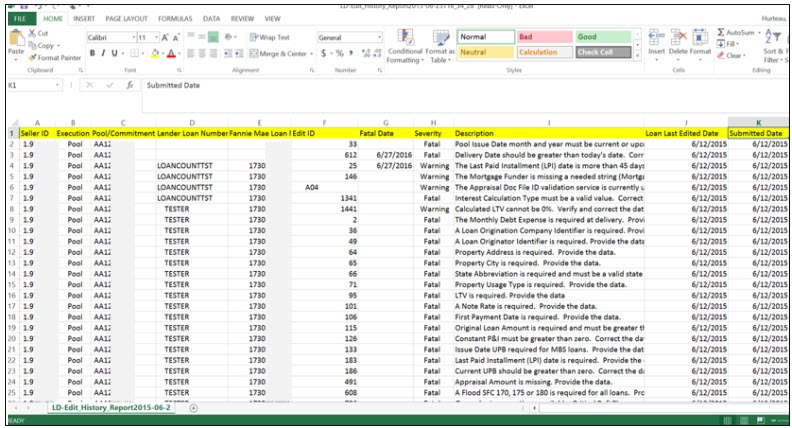 What this Report Represents: This file opens as an Excel® spreadsheet, by default, which contains a detailed list of all the remaining edits on specific loans after submission for existing pools or commitments. The report can be run in monthly increments for pools or commitments submitted within a given month. Select the option of the month you would like to display. The Edit History CSV report provides information on when the loan was submitted, what the severity status of the edit was at the time of submission (including edits that are informational severity) and a new field that identifies whether the edits are planned to go from ‘warning-to-fatal’ (new field called Fatal Date).