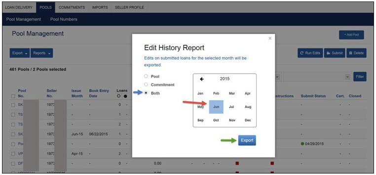 A new Edit History Report dialogue box is displayed. Select the radio button for a Pool, Commitment or Both (see left arrow). Select the month you desire (see middle arrow).