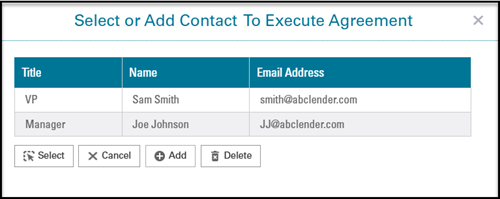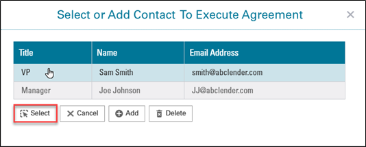 - Click on the contact of choice, then click Select to request an electronic signature agreement via DocuSign.