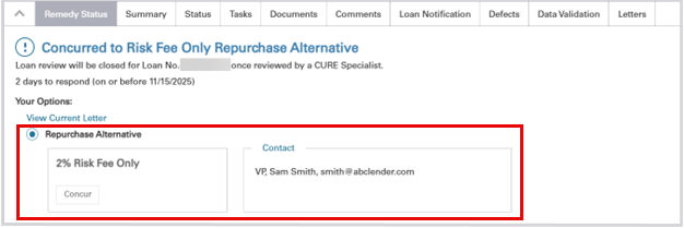 Note: After concurring to a Repurchase Alternative, Fannie Mae will send the agreement via DocuSign to the designated signer the lender identifies. The lender has 15 days to execute the agreement before it expires. After execution by Fannie Mae, the lender will receive an email notification that the agreement has been completed. The notification will include the link for the lender to retrieve the fully executed copy for their records. The Fannie Mae contact on the loan will upload an executed copy to Loan Quality Connect.