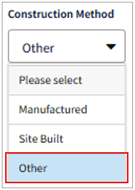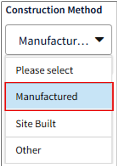If it is MH Advantage, select Other in the Construction Method field. TheManufactured Home Width andMH Advantage fields will be displayed.