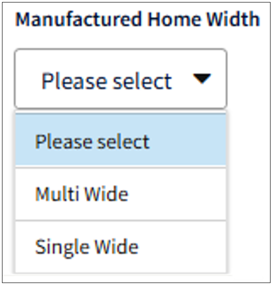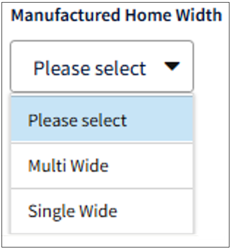 The Manufactured Home Width field will be displayed. Select the width of the manufactured home.