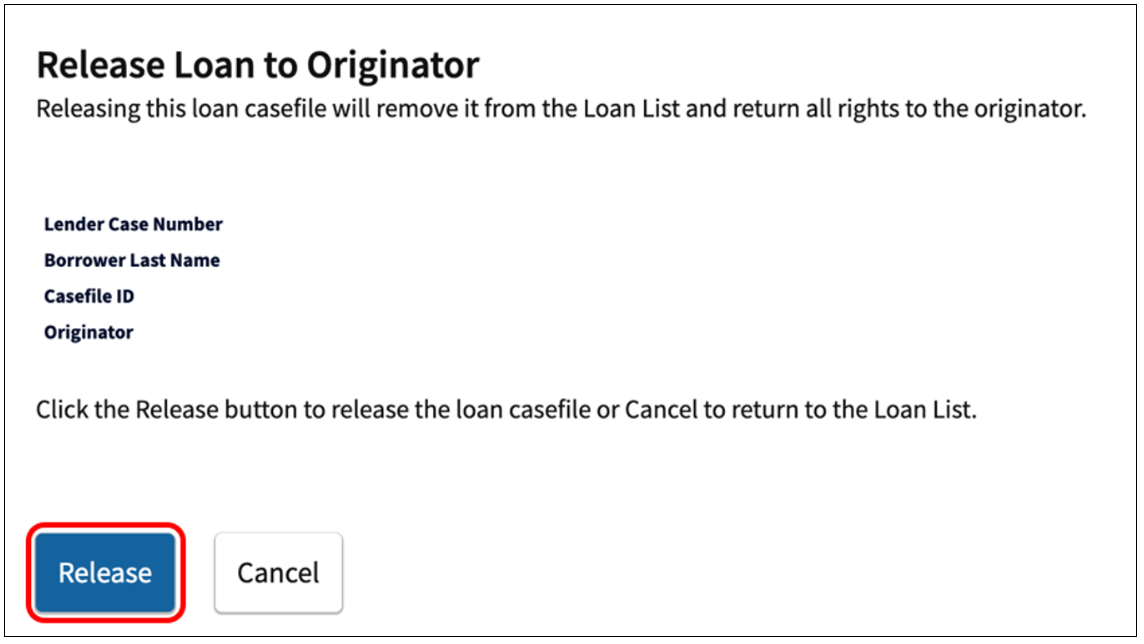 - TheReleaseLoantoOriginator screen will be displayed. ClickRelease.