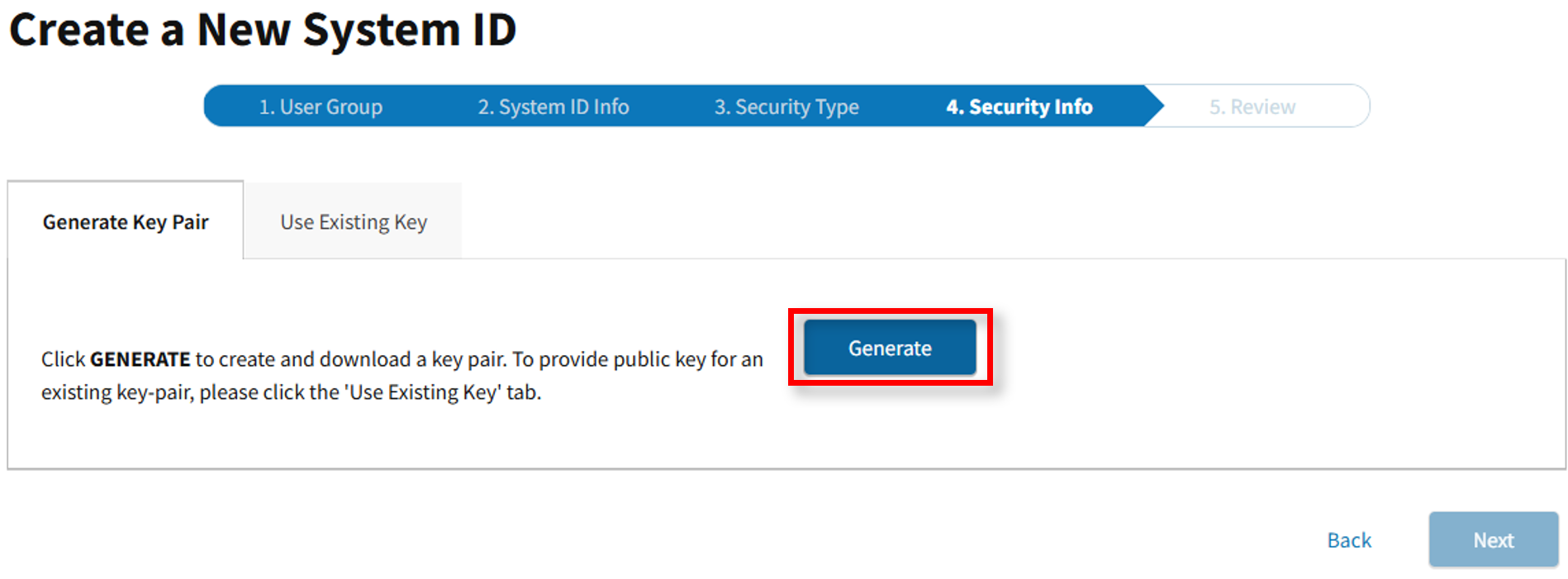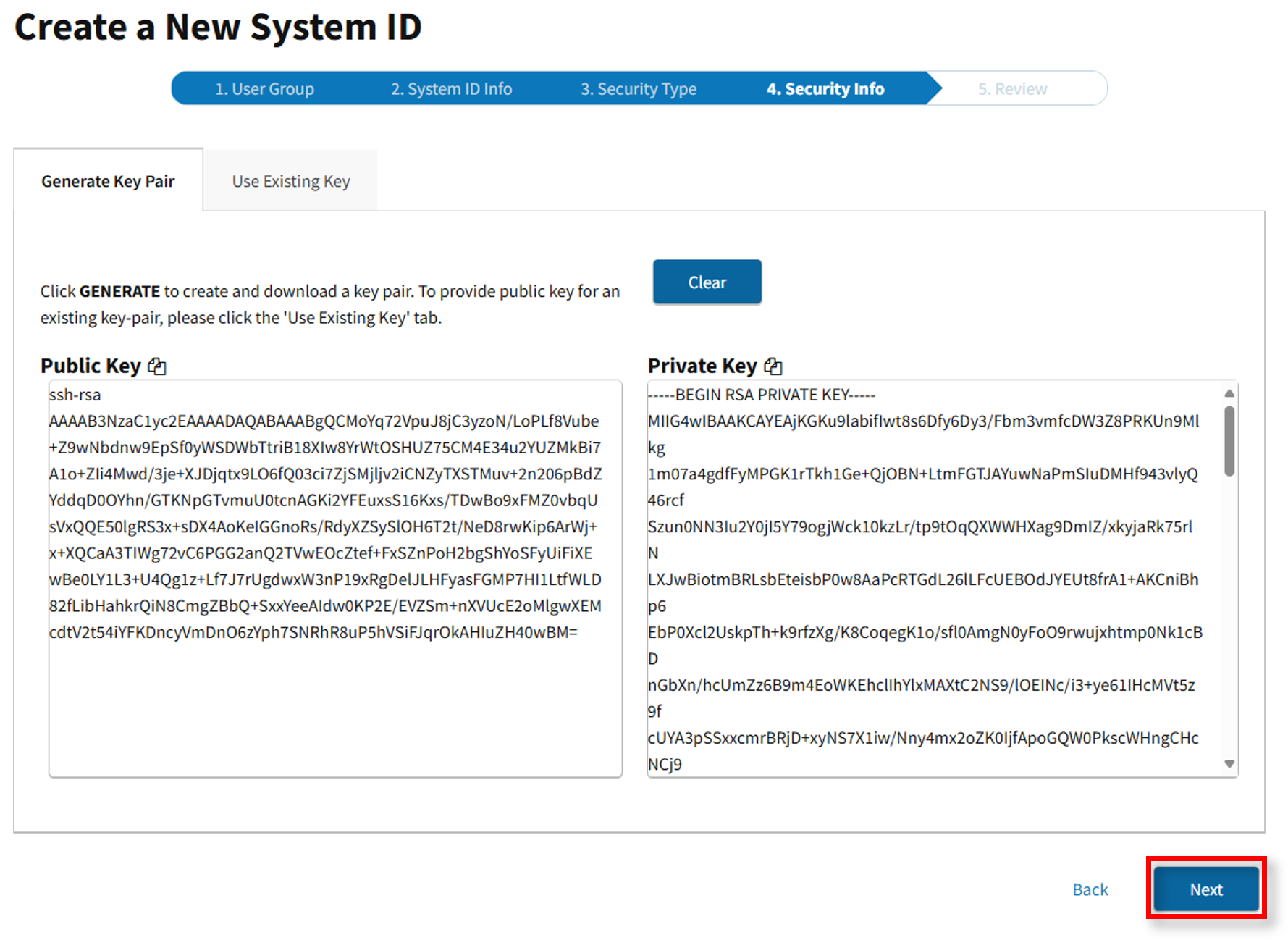 Note: If you already have an existing public key, select the Use Existing Key tab and upload the public key.