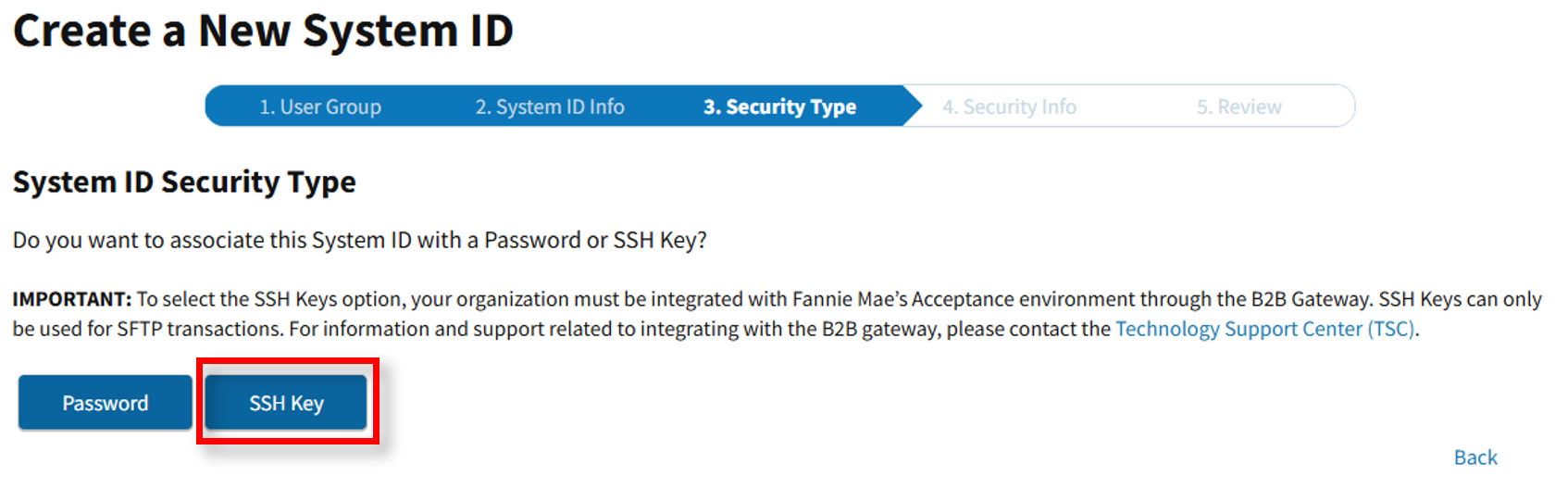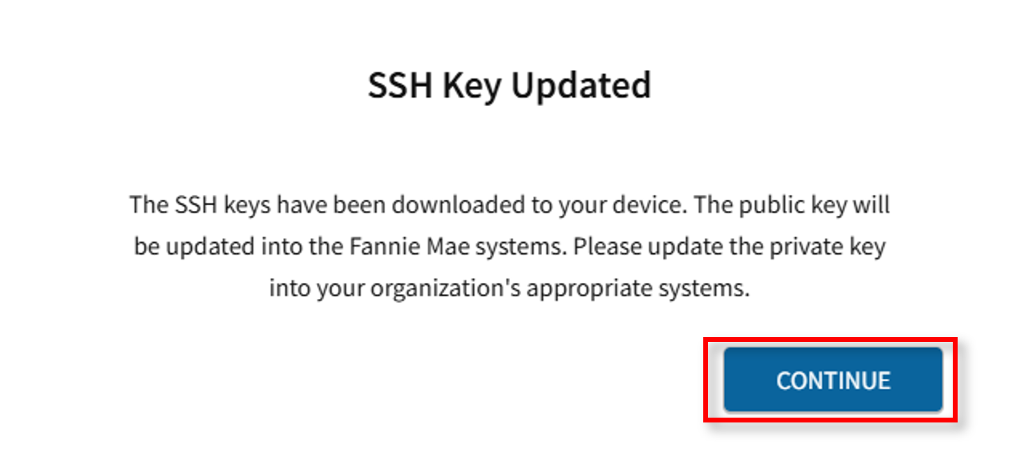 Notes: It is important to plan before you begin to use SSH Keys. Be prepared to update the private key in the appropriate systems and servers to avoid any interruption to business activities. The public key will be updated within the Fannie Mae systems.