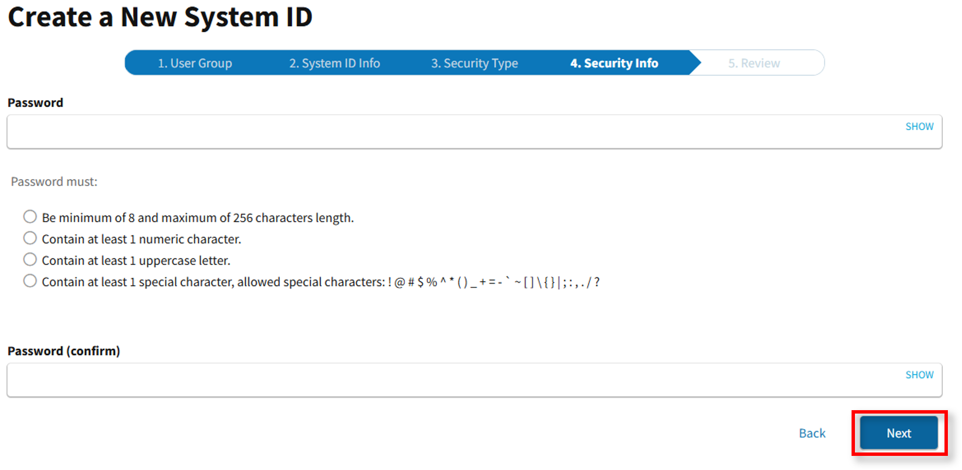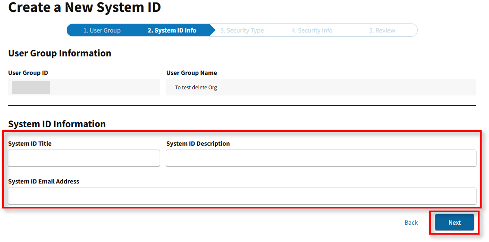 The User Group Information screen appears. Complete the remaining required fields of the new System ID, then select Next.