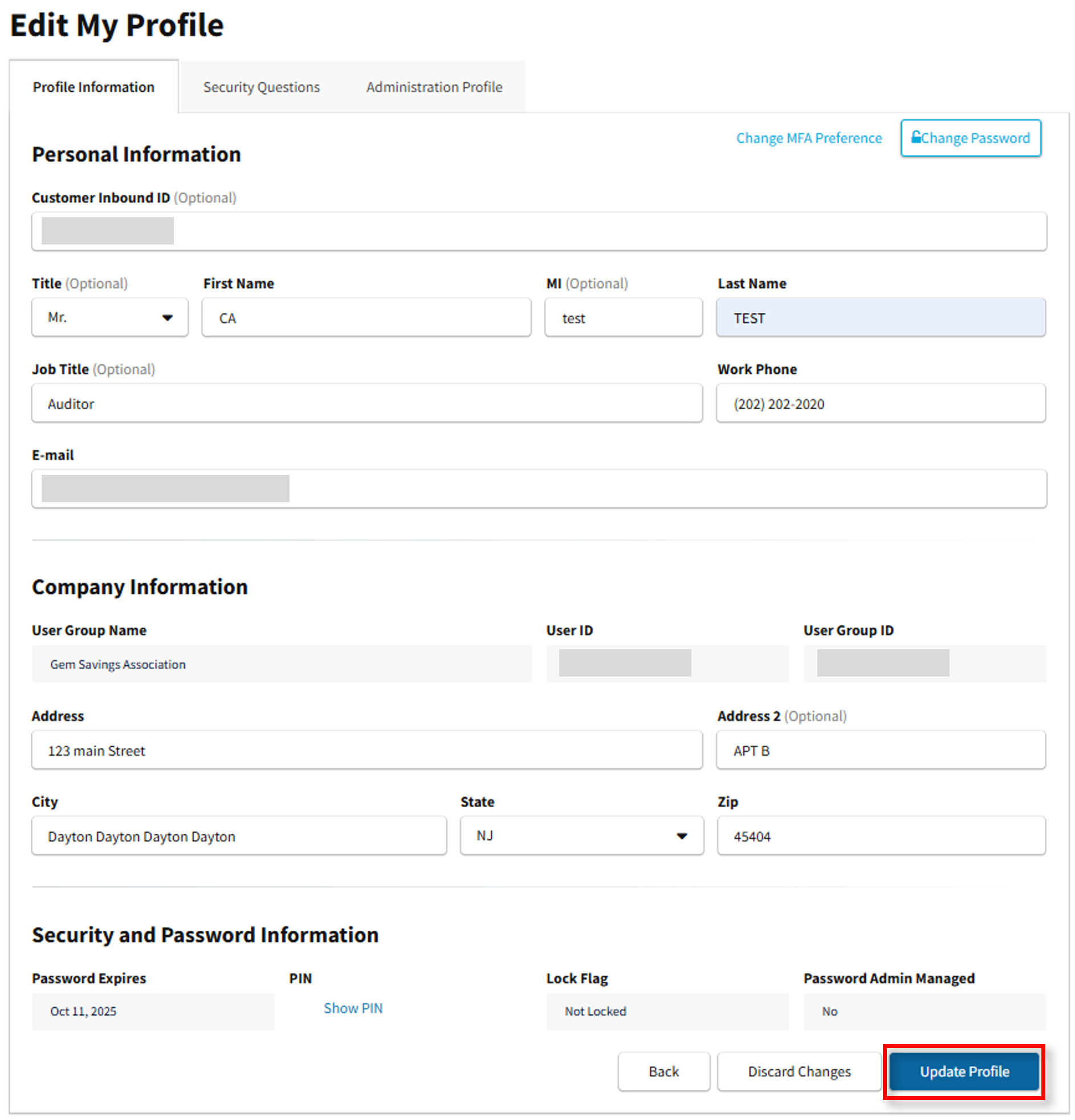 Note: Update your email and Work Phone information as these change. Up-to-date information is necessary for successful password resets.