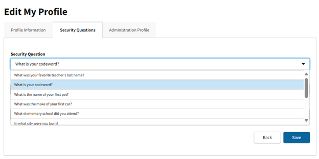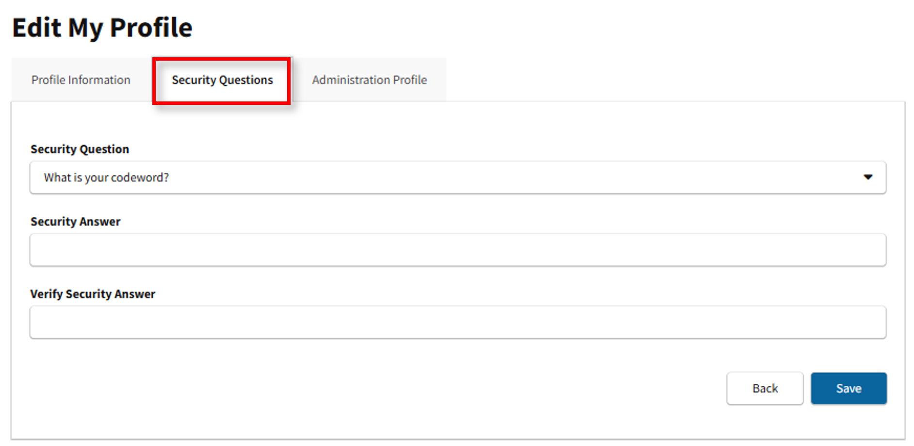 - From theEdit My Profile screen, select theSecurity Questions tab.