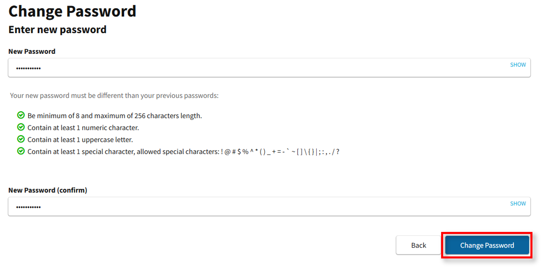 - The Change Password screen appears. Enter your Current Password, New Password and New Password (confirm), and select Change Password.