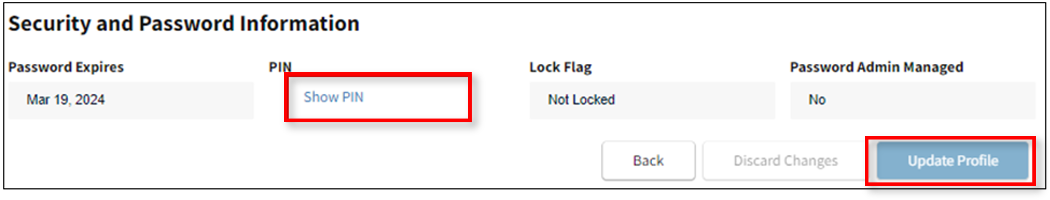 From theSecurity and Password Information section of theEdit My Profile screen, selectShow PIN to reveal your PIN. Change your PIN and select Update Profile.