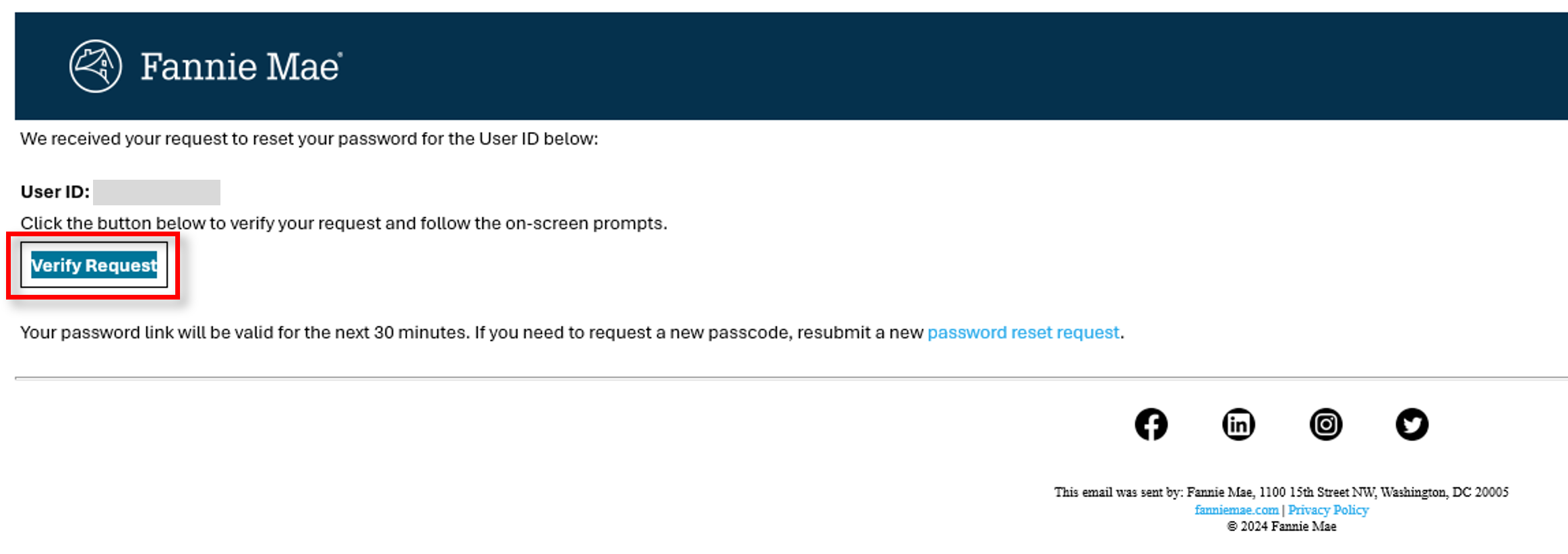 Once you receive the password reset email, select Verify Request to confirm your User ID and you will be navigated to set up a new password.