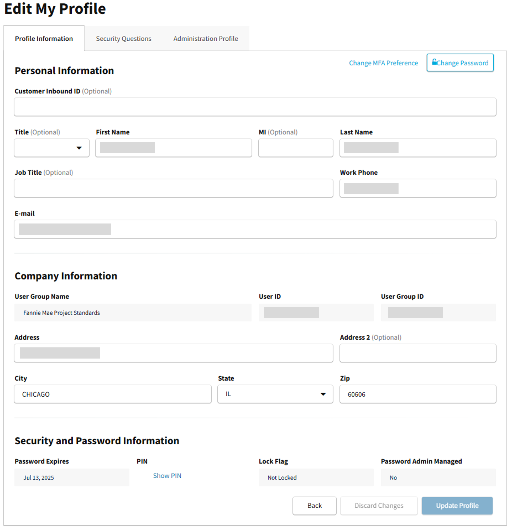- The Edit My Profile screen appears. Review your profile. See the Edit My Profile job aid for instructions on how to update your profile. Now you are ready to use the Fannie Mae applications granted to you by your administrator.