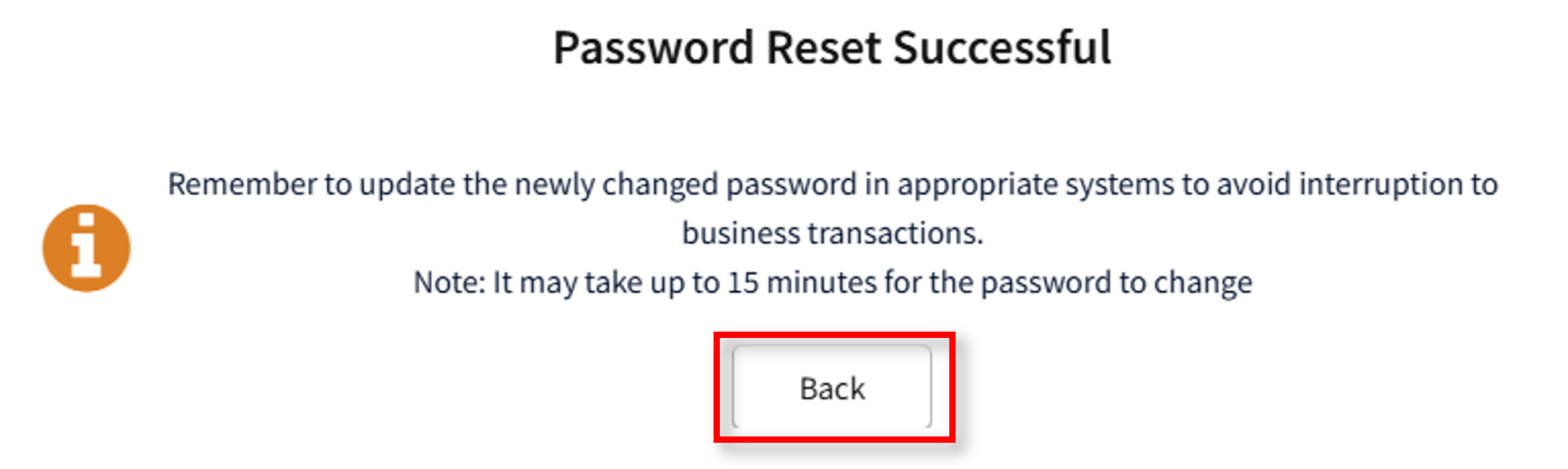 - Select Back and Password Reset Successful will appear in lower right corner.
